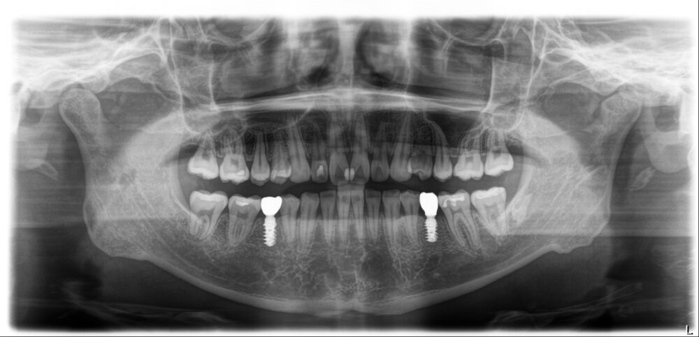矯正治療開始より1年10ヵ月後、両側下の5番目にインプラントOpeを行い、3ヵ月後プロビジョナルレストレーション(暫間修復歯)を入れることになりました。