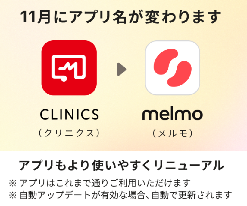 当院が予約&決済アプリ『CLINICS』は、サービスリニューアルにともない、2025年11月13日より名称が『melmo(メルモ)』に変更となりました。